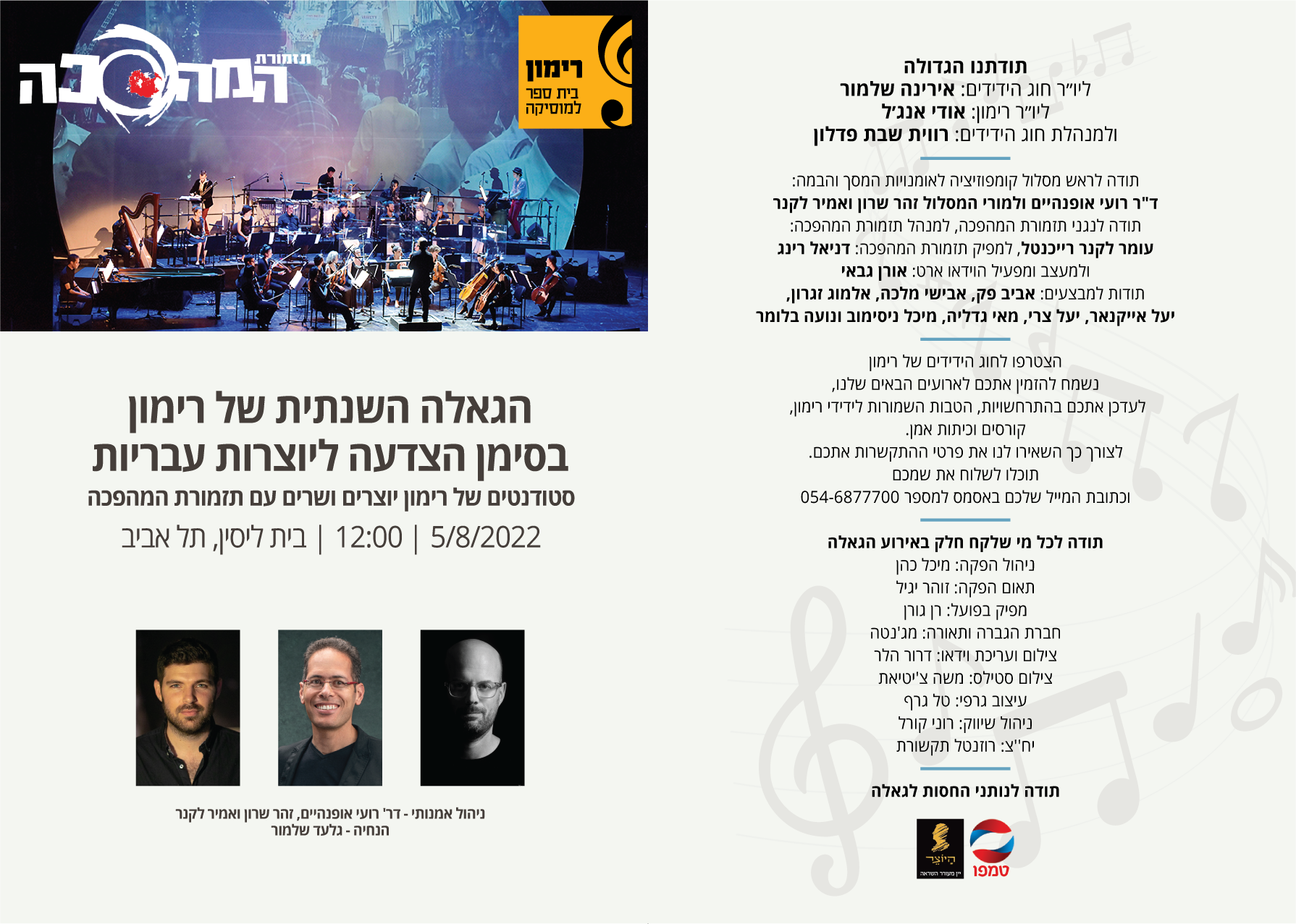 מלחיני.ות ומעבדי.ות ביה"ס רימון: אליה אזרזר, רועי כשר, עמר האוזנר, נעה עוזר, בר דימרי, רוני בצ'לדין, יאיר צ'סלר, נור חיל, נדב מלמד, לירון יובל, רום דן הופמן, גיא מנור, טום סטרונג, בן ארנון, גיל קיטה.